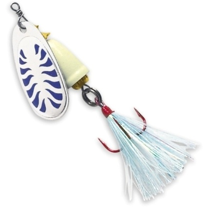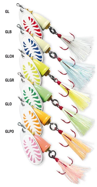 Vibrax Glow är en självlysande spinnare som syns otroligt väl i alla typer av vatten. En färgad tofs är monterad vid kroken för att vara extra lockande.
