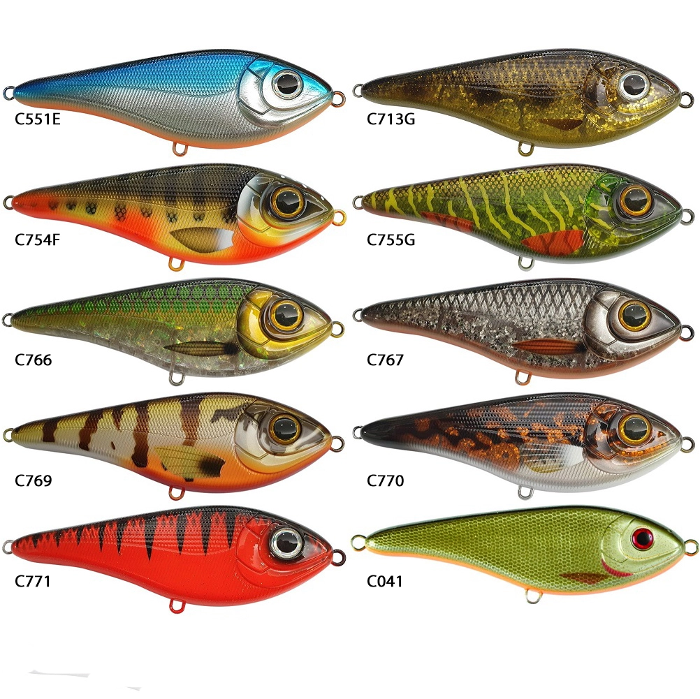 Buster Swim Slow sink 13cm – Detta är en bredare och kortare version av orginalet, Buster Jerk. Den är designad för att ha den klassiska S-kurvan som ett swimbait ofta har, i varje paus så glider den ut åt sidan och vaggar sakta ner den sjunker. Buster Swim är försedd med två 2/0 trekrok och är av en solid konstruktion.