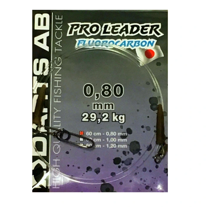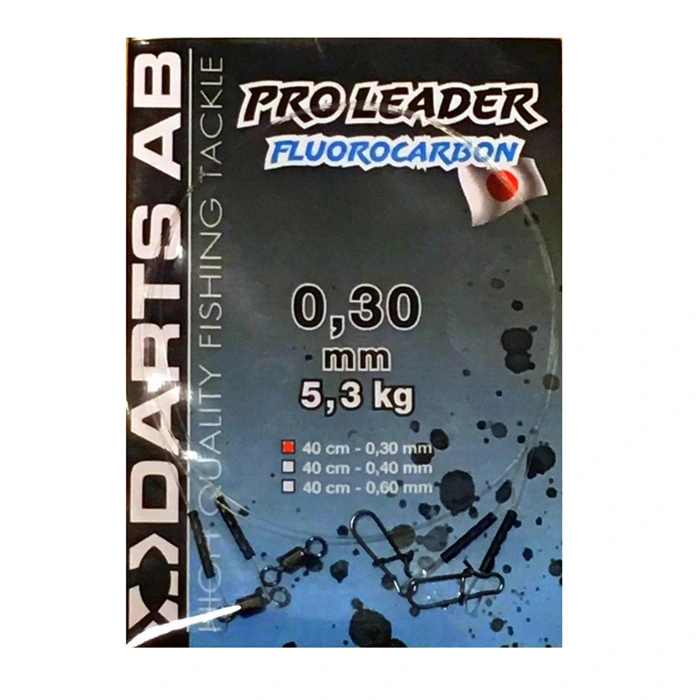 Darts Pro Leader Flourocarbon är en tafs avsedd för allt från abborre och gösfisket(40cm) till det tyngsta gäddfisket(60cm). Tillverkad av Dartskomponenter och 100% japansk fluorocarbon. Gäddtafsarna har ”Secure Snap” beteslås och abborre/göstafsarna har ”Nice Snap” beteslås.