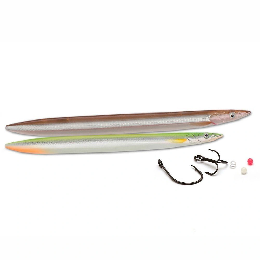 Kroppen är tillverkad av stark ABS plast med fantastiska detaljer. Line Thru Sandeel är ett sk. ”Line Thru” bete vilket innebär att löper linan genom själva betet och kroken knyts fast direkt i linan/tafsmaterialet (vi rekommender fluorocarbon som tafsmaterial). Line thru konstruktionen gör betet långkastande samtidigt som betet kan löpa fritt på linan vilket gör att havsöringen har svårare att bryta sig loss mot betet under kamp.